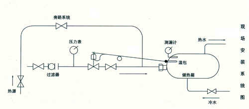 (3)為使自控系統(tǒng)或檢修閥門時(shí)仍能連續(xù)運(yùn)行,應(yīng)設(shè)置旁通閥,閥前須裝過(guò)濾器,壓力表,在傳感器附近裝測(cè)溫計(jì),便于現(xiàn)場(chǎng)監(jiān)視與溫度設(shè)定。見(jiàn)下圖: